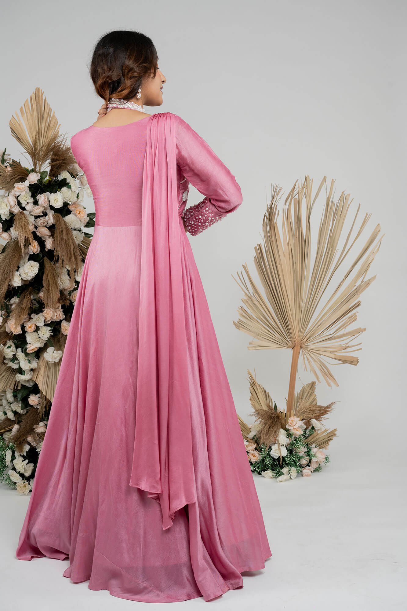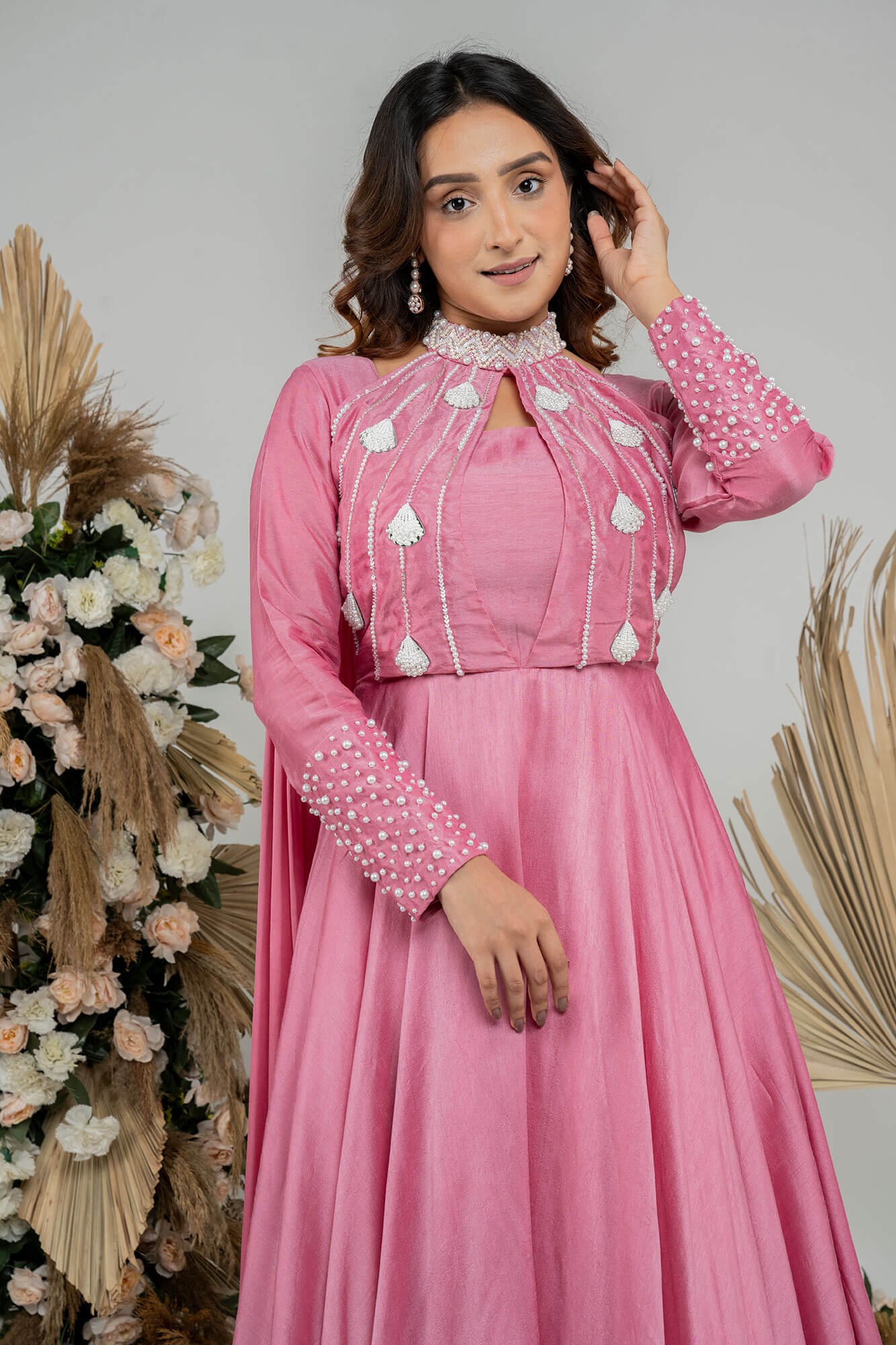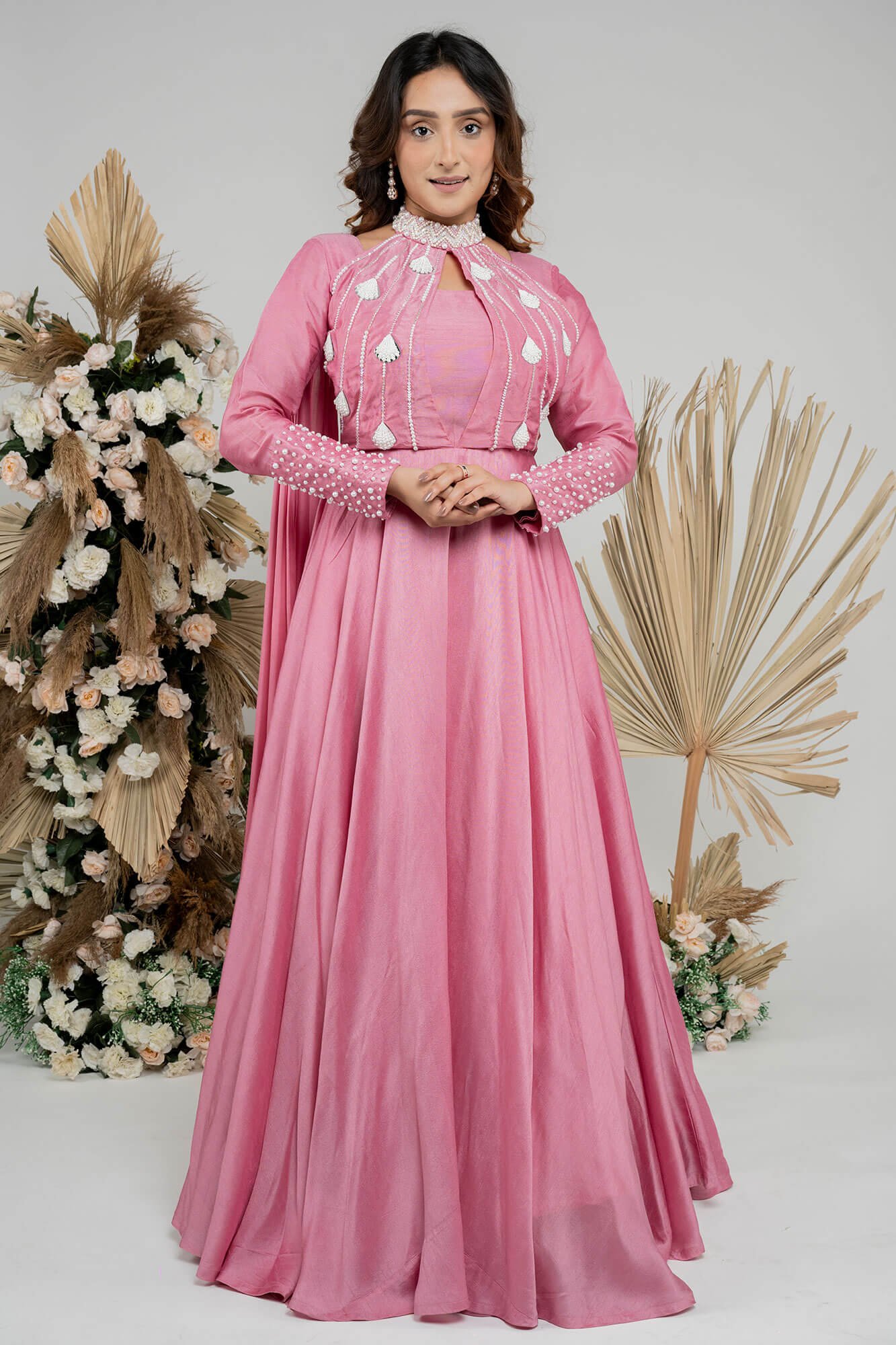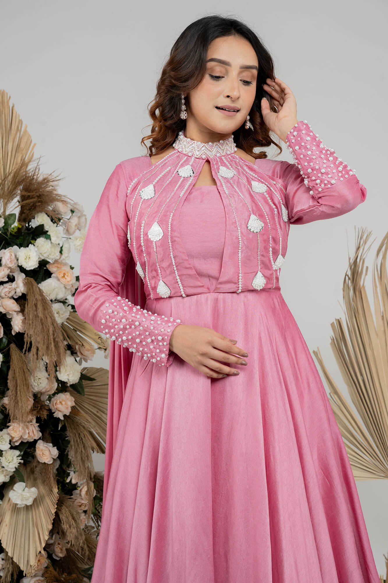 The dress boasts full sleeves and an elegant alter neck design adorned with delicate pearl work, all in a lovely shade of onion pink.