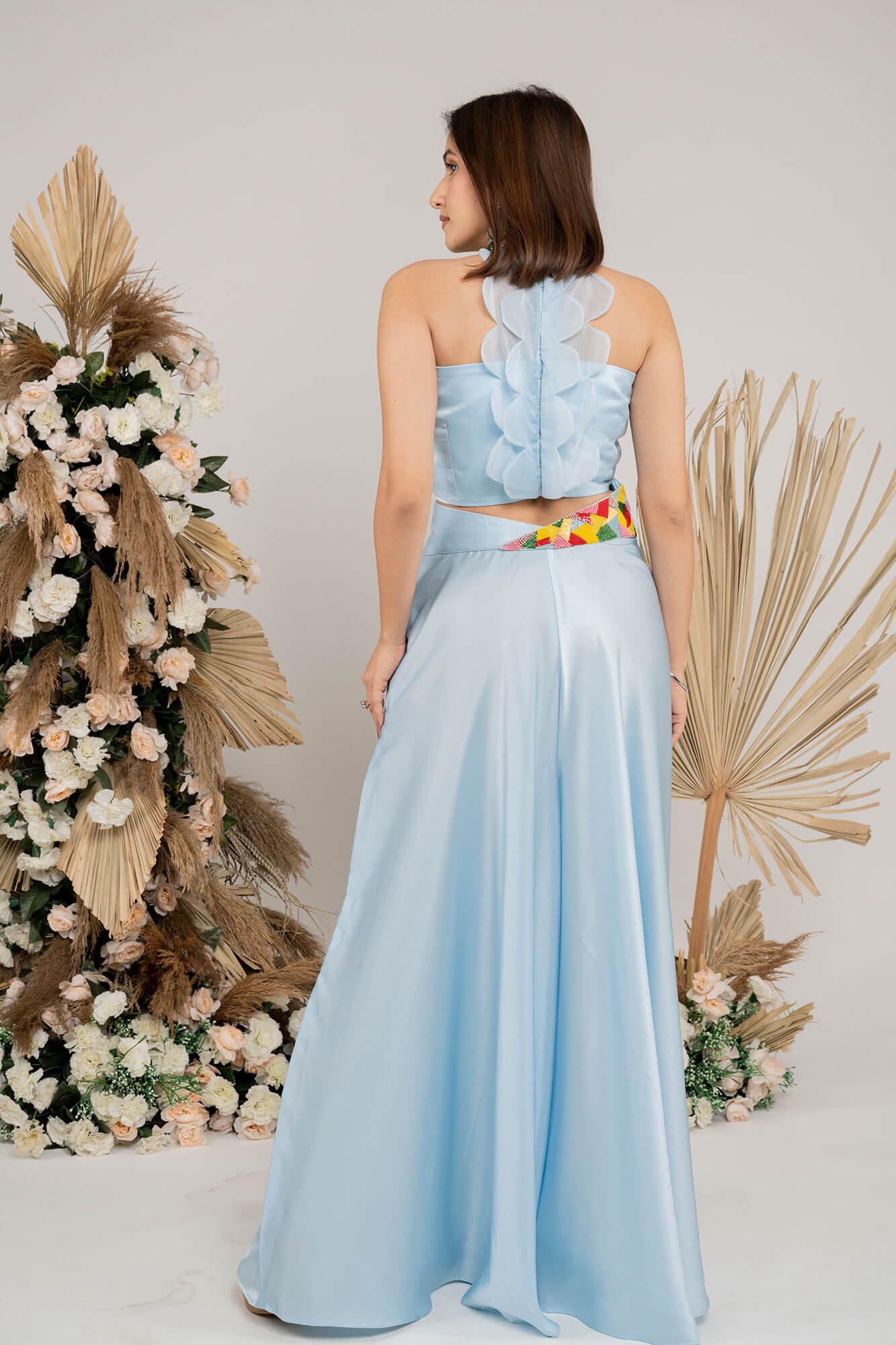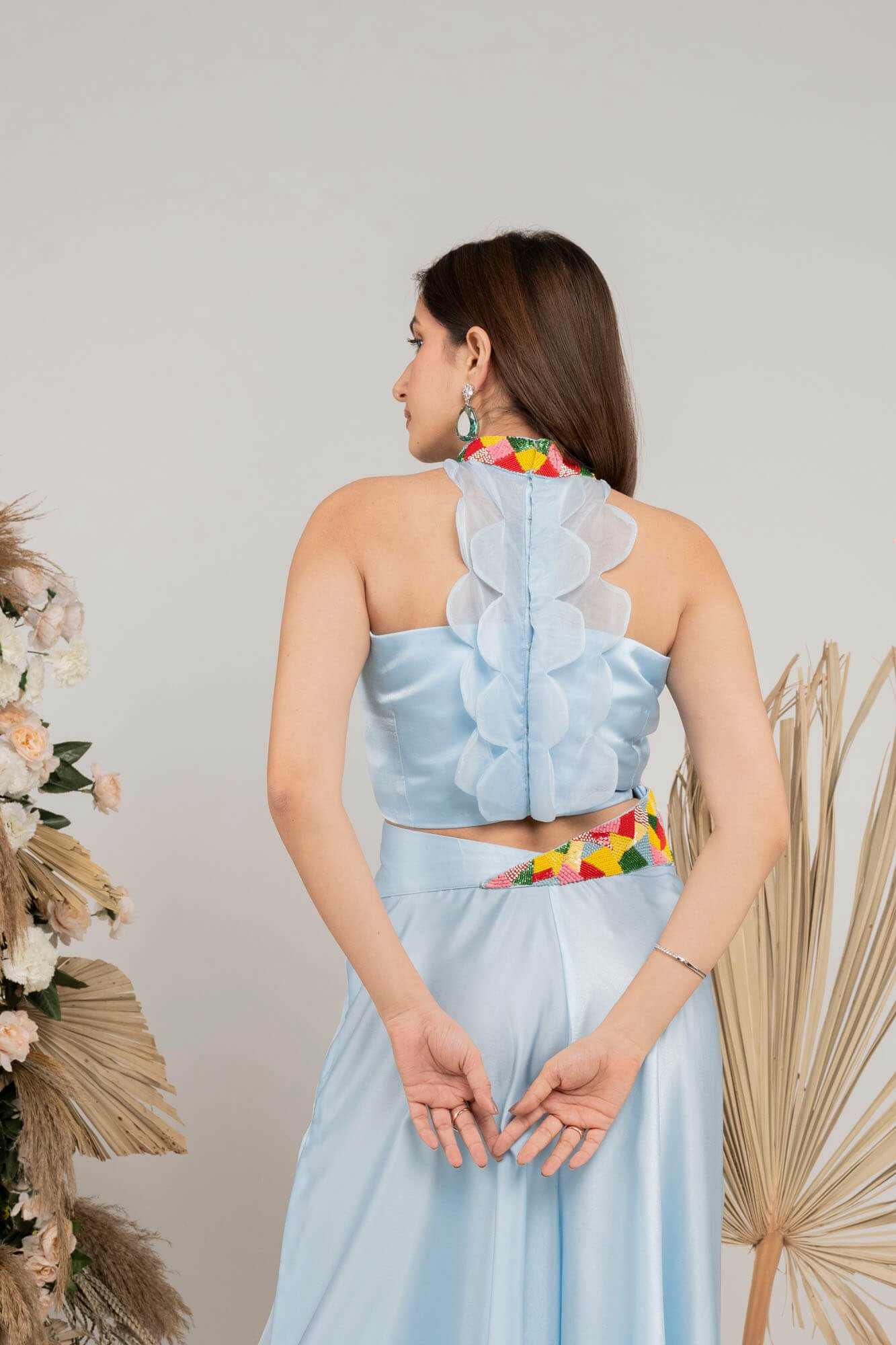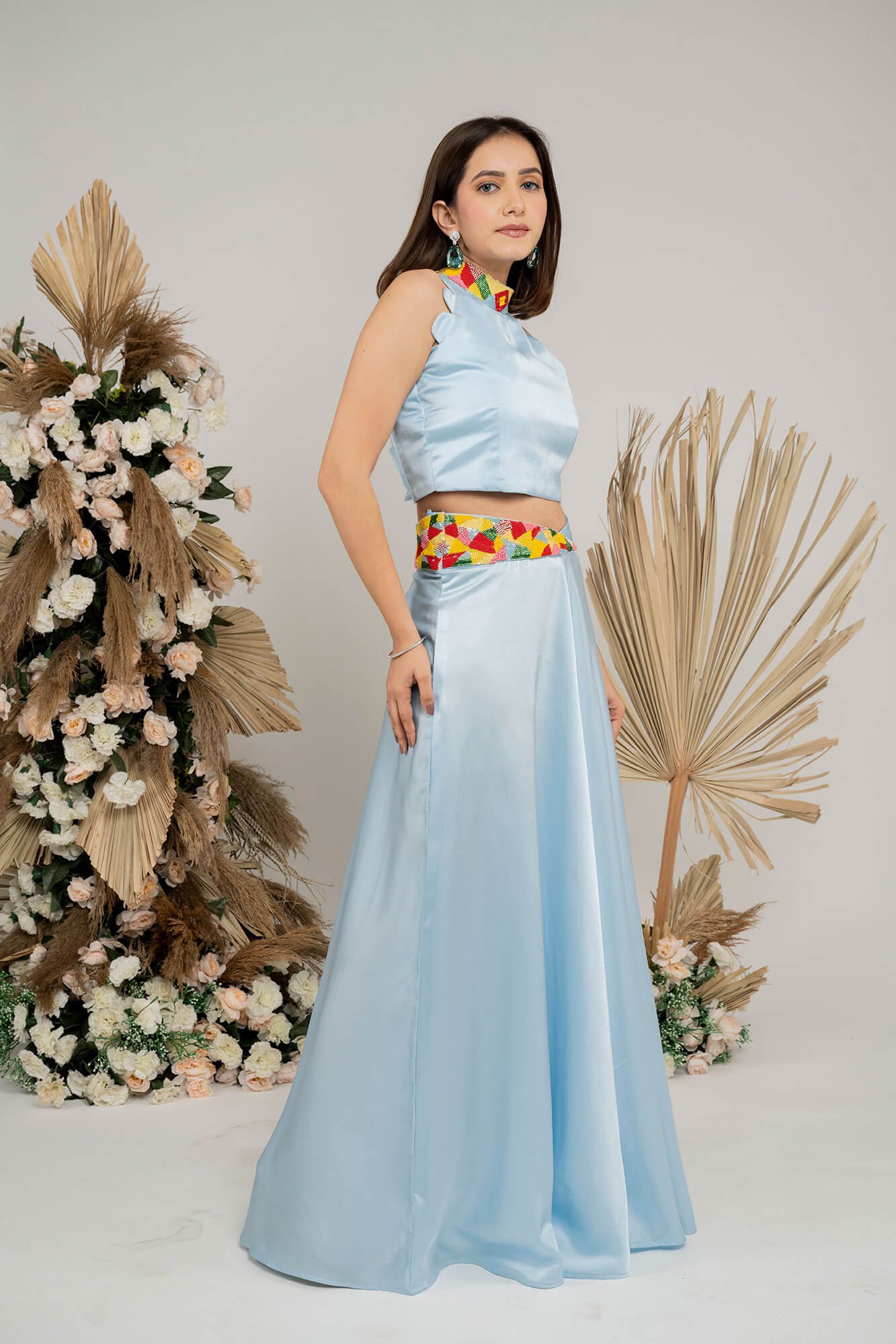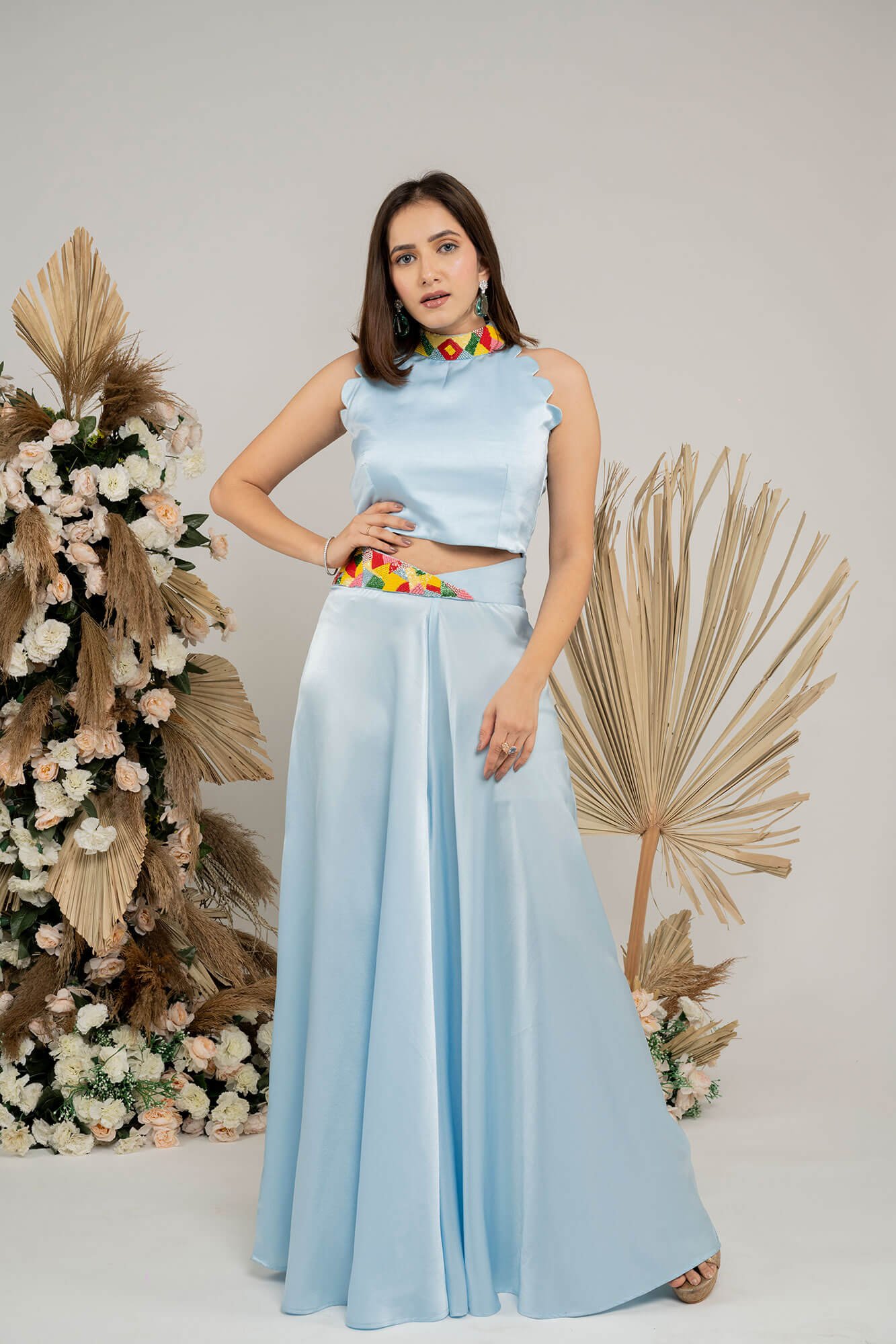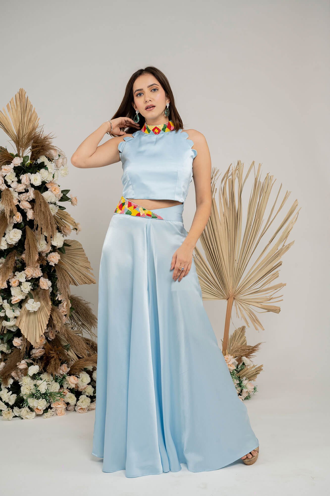 The rust orange co-ord set features vibrant multi-color beadwork, adding a lively and eye-catching touch to the ensemble.