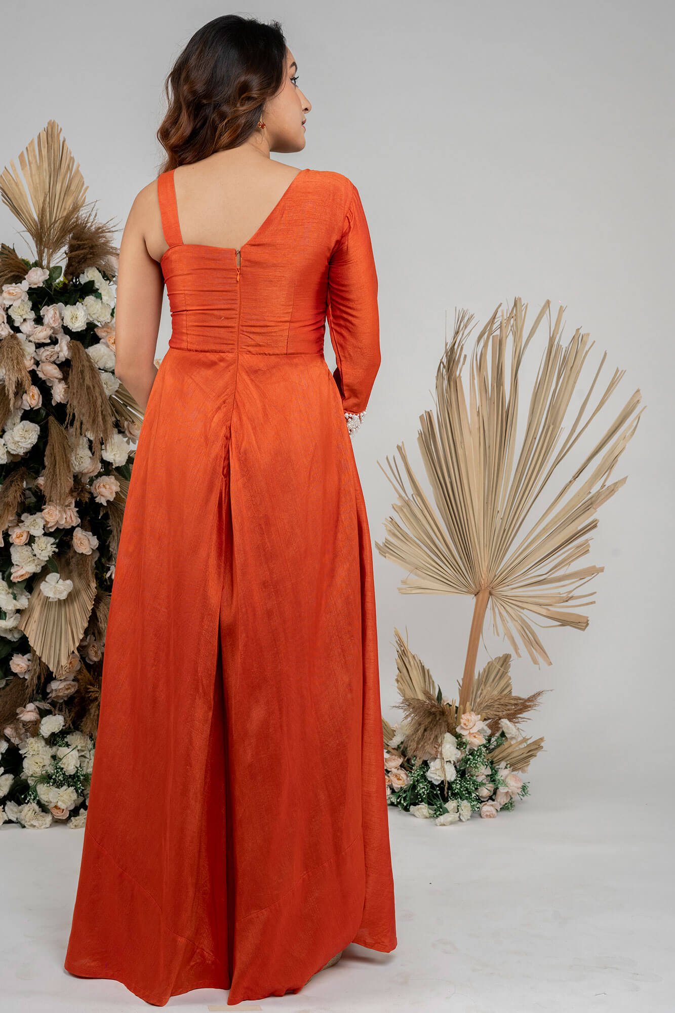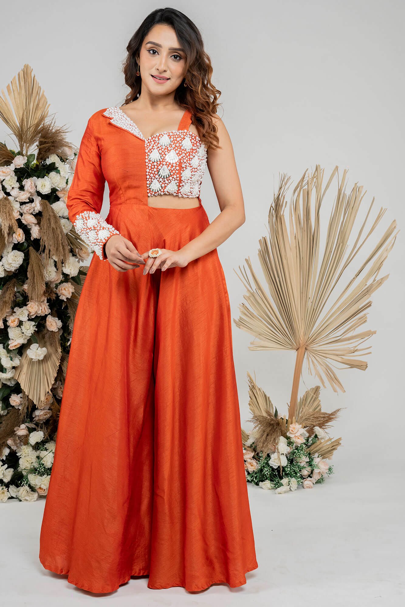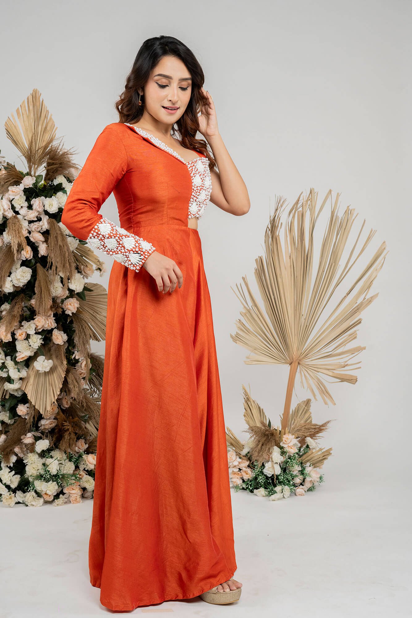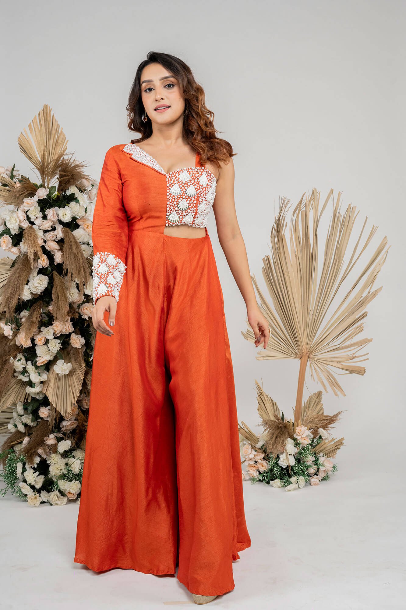 In a rich rust orange hue, the garment boasts a unique one-sleeve design with a collar, adorned with a captivating combination of pearls and shells for added elegance.