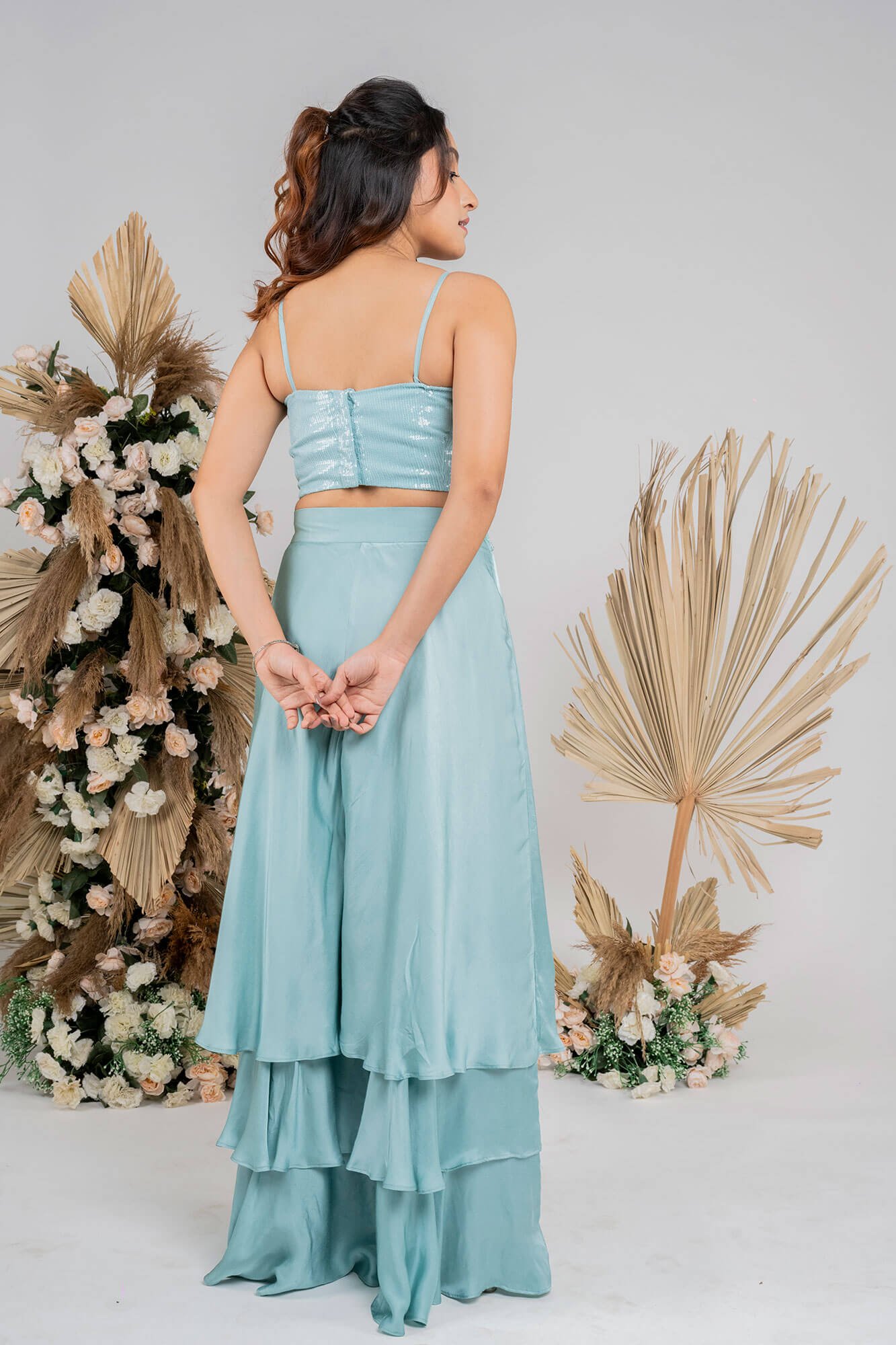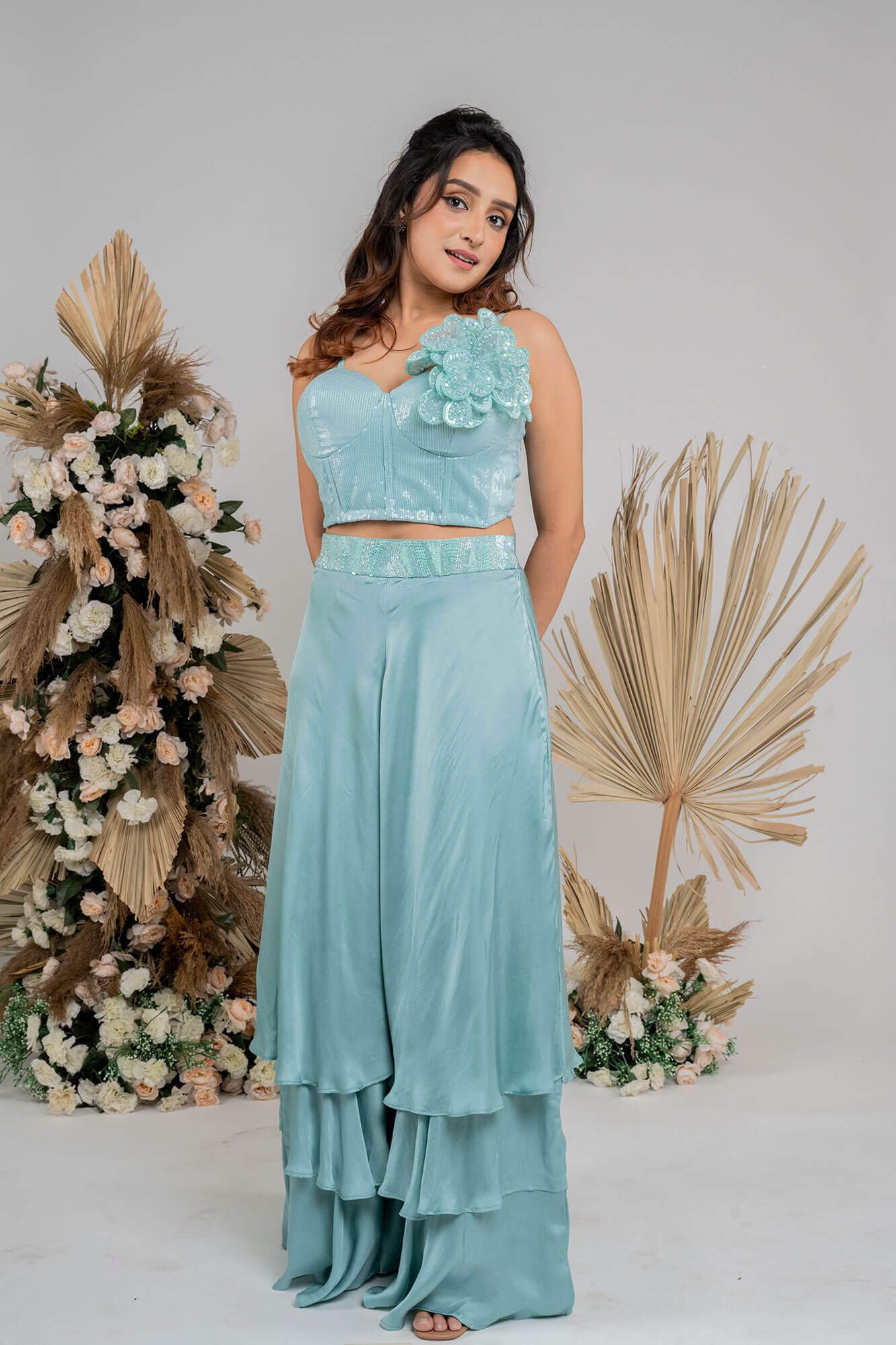 The coordinating set features a stunning bustier adorned with intricate sequence work and 3D flower embellishments, creating a captivating and elegant ensemble.
